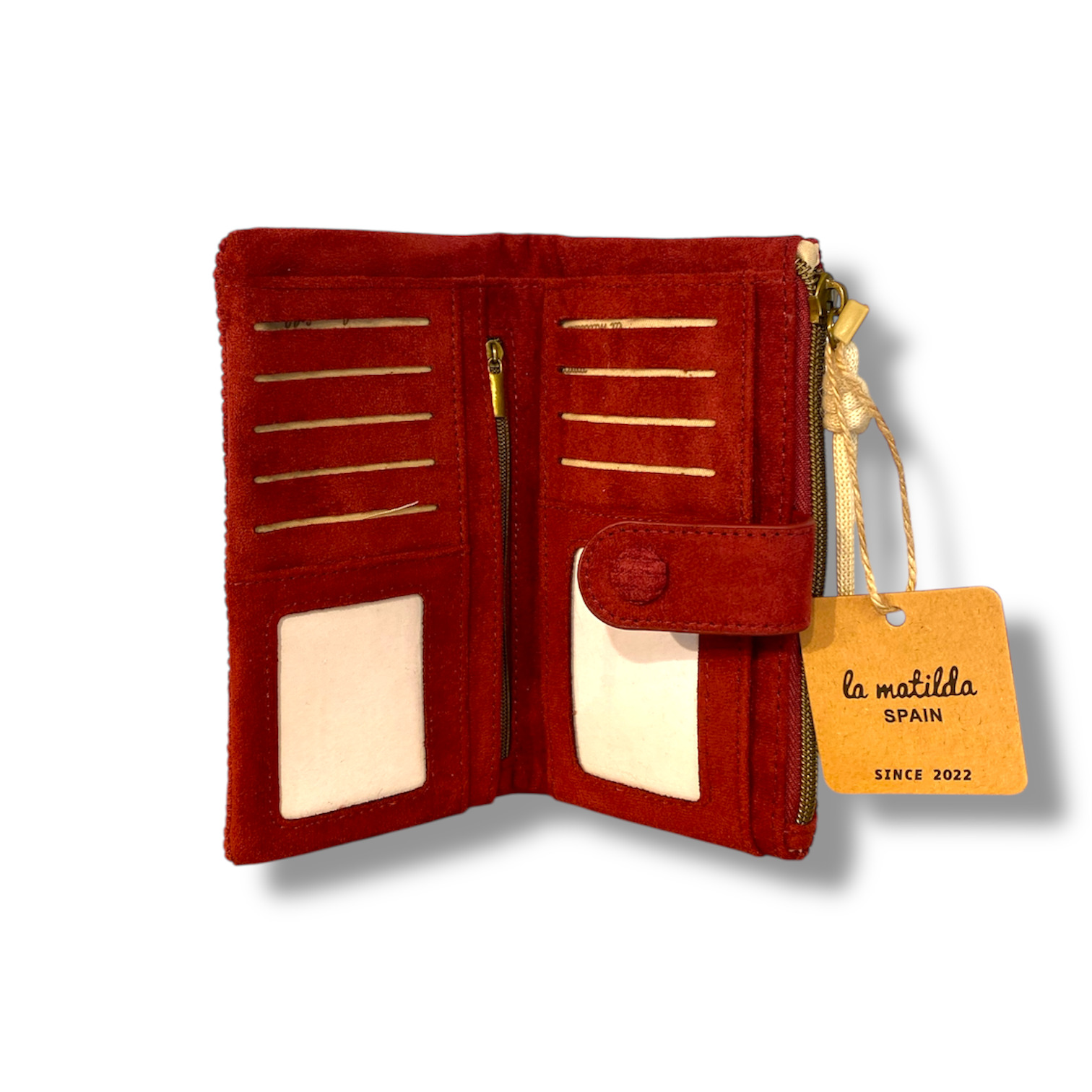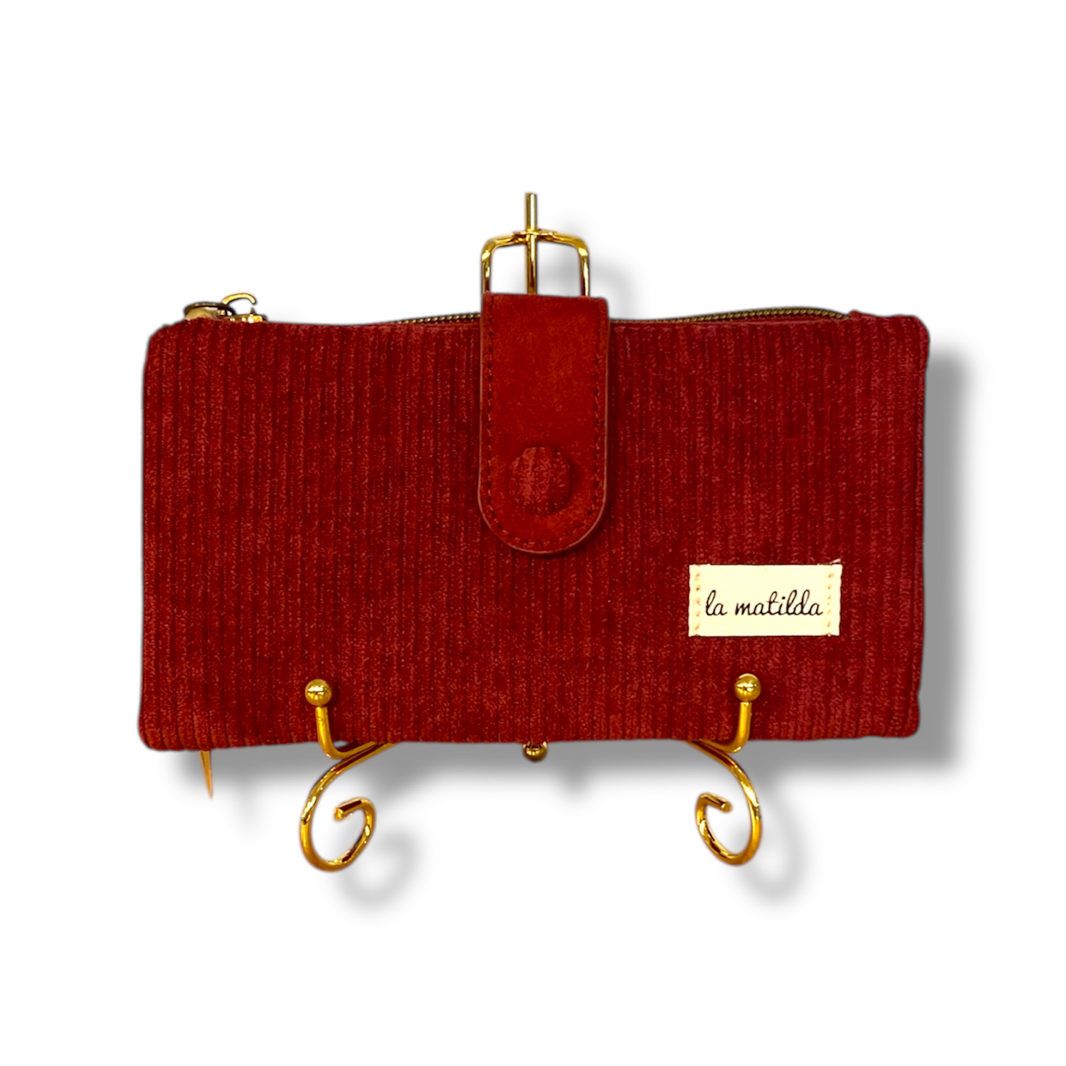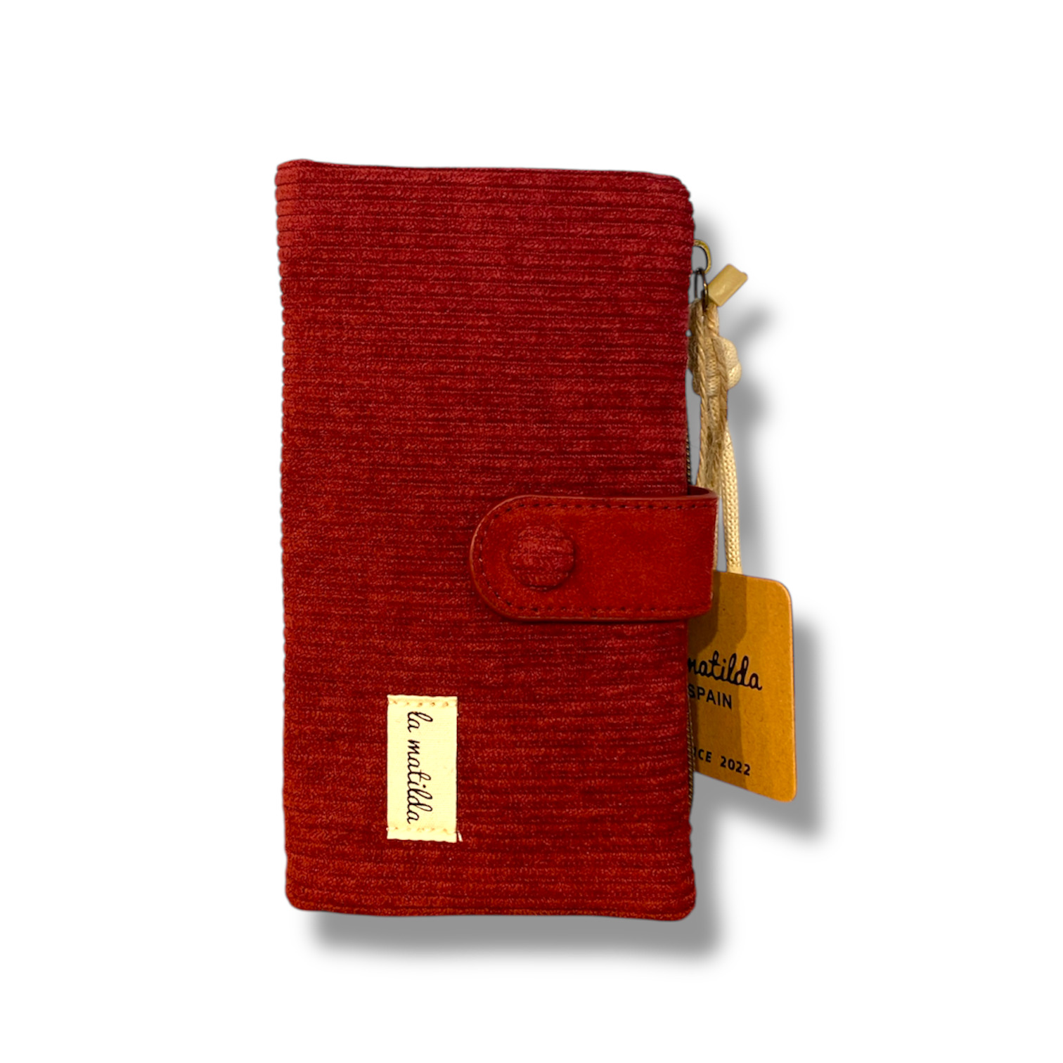 Con diseño rectangular y cierre de cremallera en la parte superior, esta cartera ofrece espacio extra sin perder ligereza. El tirador de tela anudado añade un detalle artesanal y distintivo propio de la matilda.