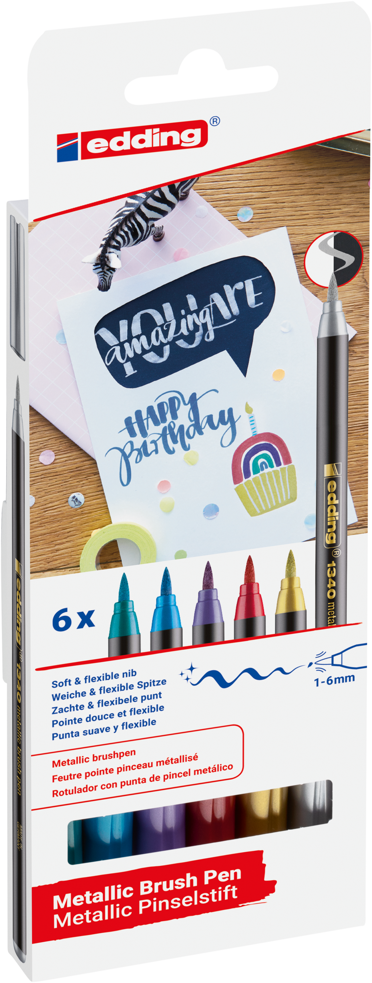 Pack de 6 rotuladores con punta pincel de colores metálicos. La tinta en colores brillantes es opaca, resistente a la luz, de olor neutro y no traspasa el papel.
